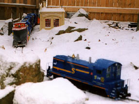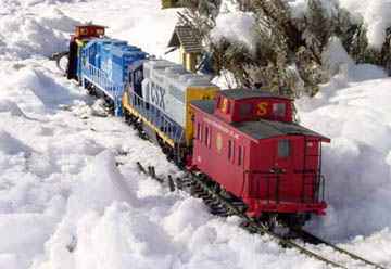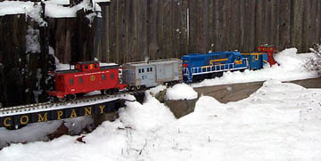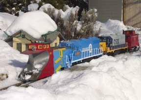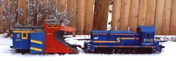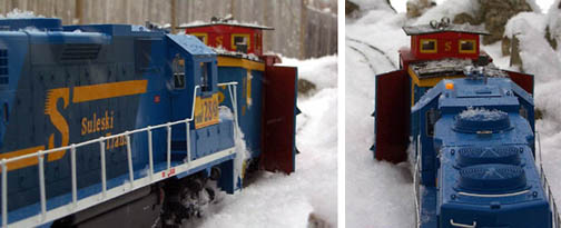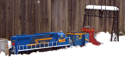 When snow is very heavy and deep up to three diesels can be assigned to Plow Extra duty. Lexi the chocolate lab can be seen riding the back porch whenever C-10 ,the grey work caboose, is assigned Plow Extra duty.